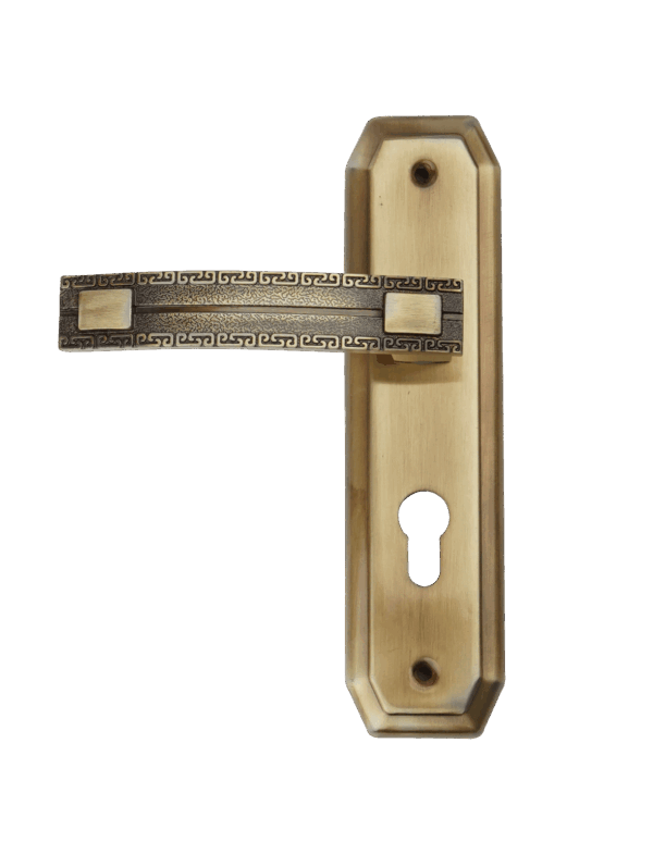 Crafted from premium brass alloy and finished in a rich antique gold tone, this handle lock features elaborate Greek key borders and a finely textured grip that nods to royal design influences. The softly beveled octagonal backplate enhances the stately profile of the set, lending it a sophisticated presence suitable for upscale and heritage settings.